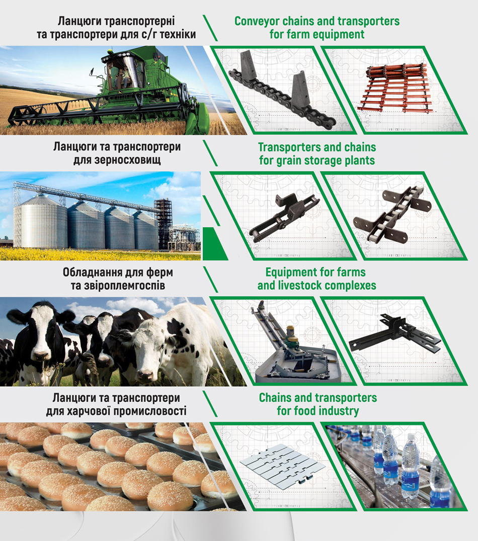 Наші ланцюги використовуються в багатьох галузях господарства, зокрема в аграрній галузі, в машинобудуванні, в галузі